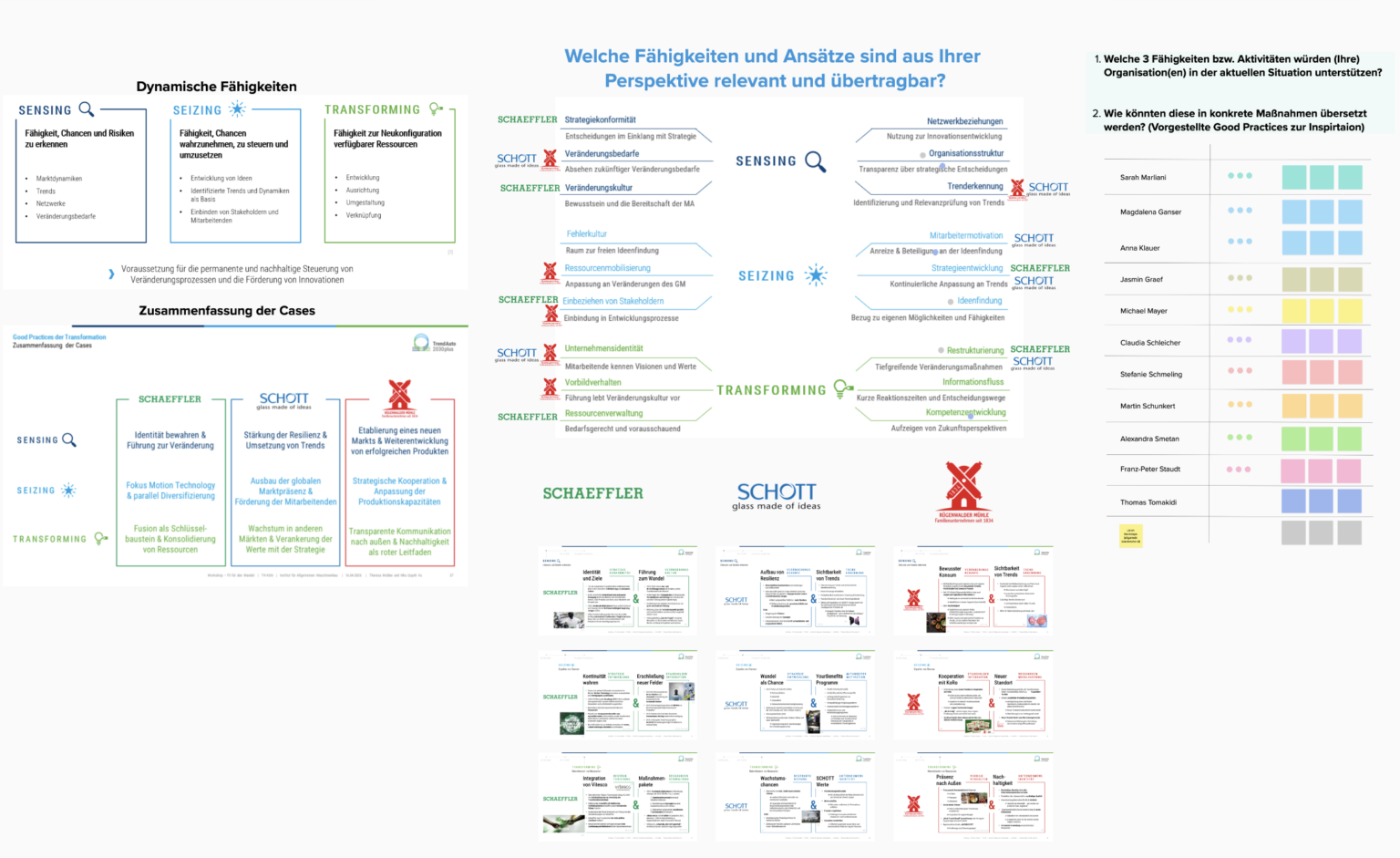 Die Schaeffler Technologies AG & Co. KG, die Schott AG und die Rügenwalder Mühle Carl Müller GmbH & Co. KG stehen beispielhaft für erfolgreich umgesetzte Transformationsprozesse. Vor dem Hintergrund des Konzepts dynamischer Fähigkeiten wurden diese drei Fallbeispiele analysiert, insbesondere in Bezug auf vorhandene Kompetenzen und deren praktische Umsetzung. Die Ergebnisse der Fallanalysen sowie weitere Inhalte des Workshops sind in der folgenden Präsentation zusammengefasst.